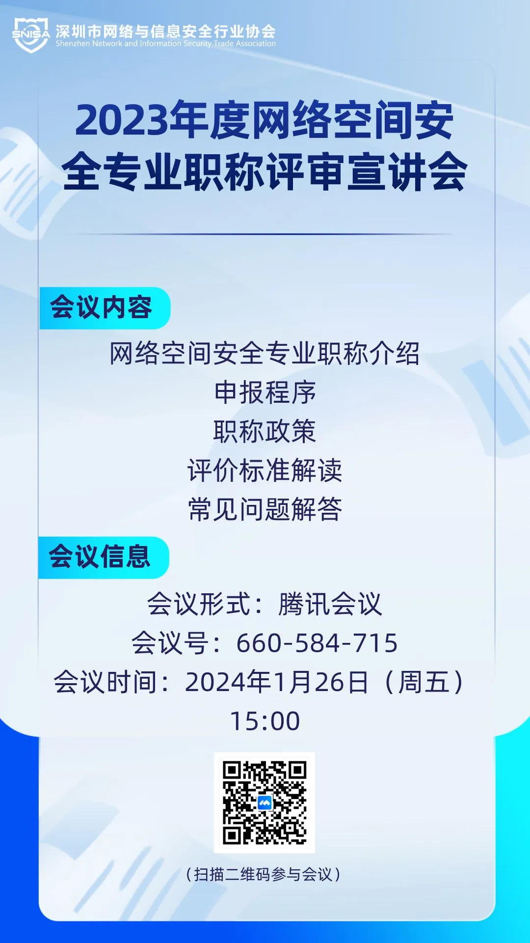为做好2023年度职称评审工作,充分调动各领域专业技术人员的积极性,确保职称申报材料规范性,提高职称评审工作效率,根据深圳市人力资源和社会保障局统一部署,我协会决定组织开展2023年度网络空间安全专业职称评审宣讲会: