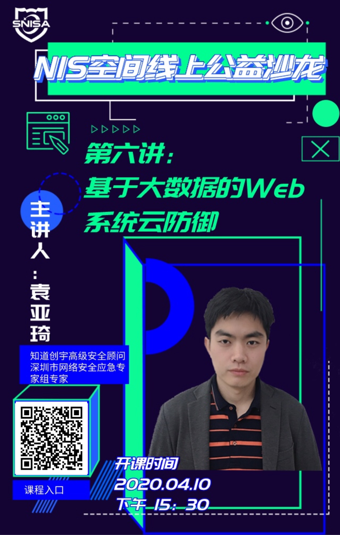 本期NIS空间沙龙第六讲,我们荣幸地邀请到了知道创宇高级安全顾问袁亚琦,为我们分享《基于大数据的web系统云防御》。