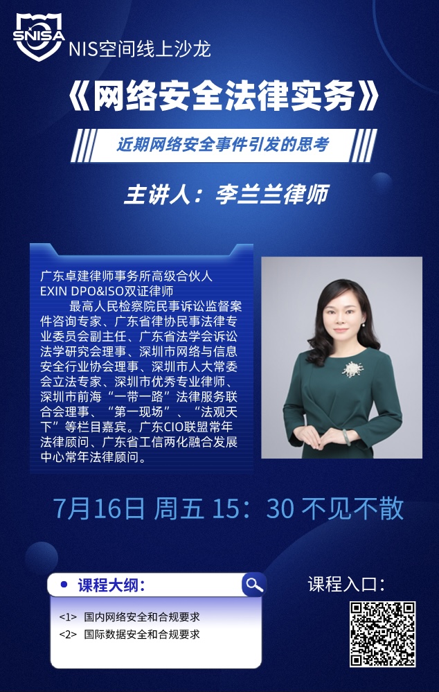 近期,由滴滴出行、BOSS直聘等知名企业被国家网信部门采取APP下架、启动网络安全审查等措施引发的网络安全、数据安全讨论甚嚣尘上,网络安全、数据安全受到空前关注。深圳市网络与信息安全行业协会理事单位:广东卓建律师事务所——高级合伙人李兰兰律师做客NIS线上空间沙龙,就以上热点事件涉及的网络安全、数据安全合规保护等法律问题进行分析、解读,本周五下午15:30敬请期待!