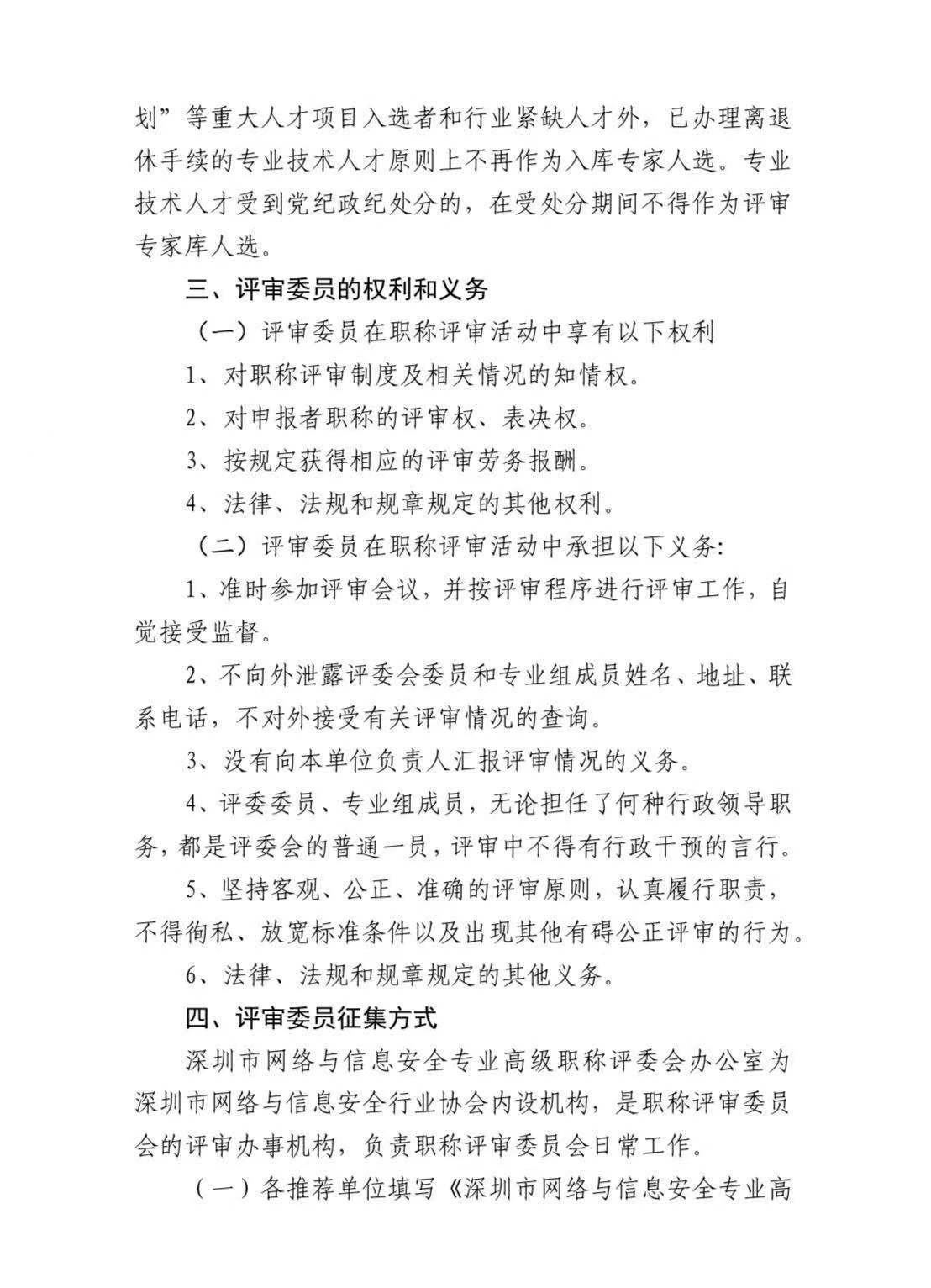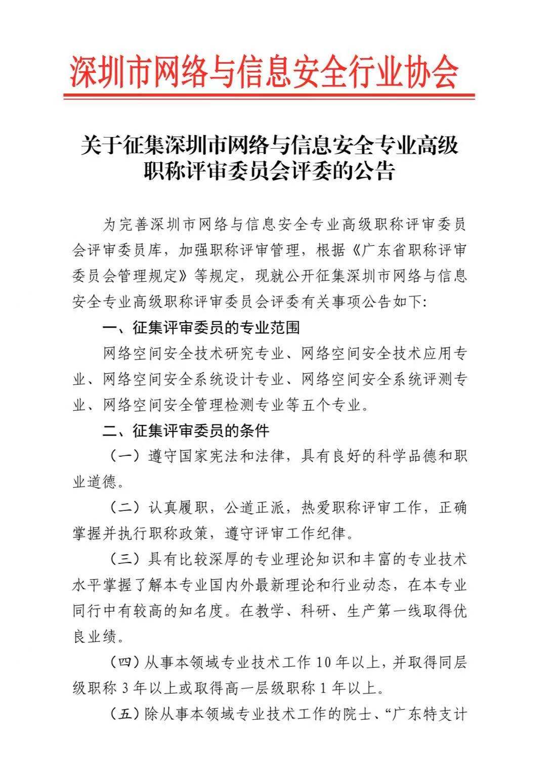 为完善深圳市网络与信息安全专业高级职称评审委员会评审委员库,加强职称评审管理,根据《广东省职称评审委员会管理规定》等规定,现就公开征集深圳市网络与信息安全专业高级职称评审委员会评委有关事项公告如下: