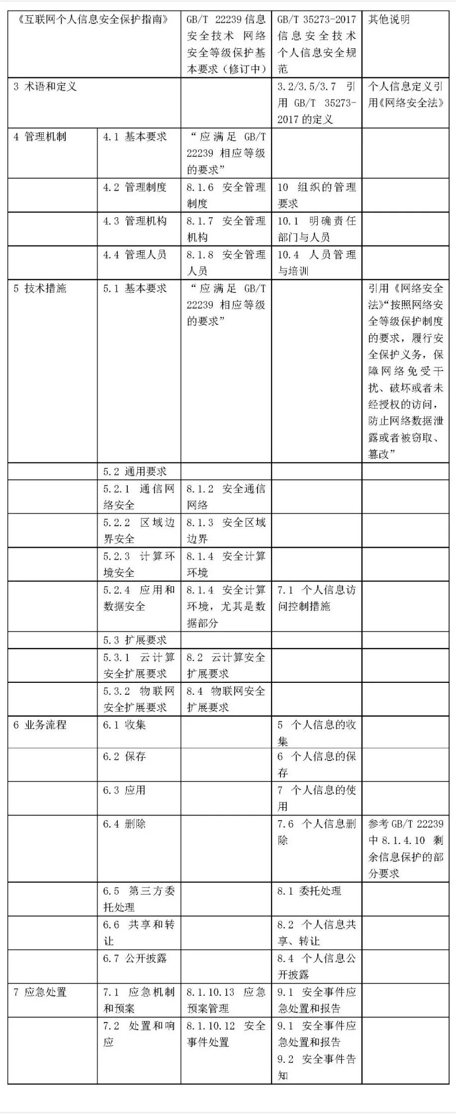 从具体内容看,指南的第4章 管理机制、第5章 技术措施、第6章 业务流程、第7章 应急处置,与《网络安全等级保护基本要求》(《信息系统安全等级保护基本要求》)和《信息安全技术 个人信息安全规范》两个国家标准从内容和要求上做了对接,具体如下:
