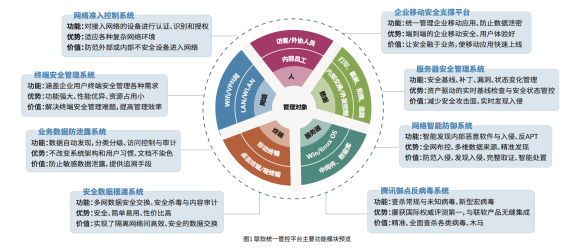 平台核心功能 数据防泄密 :将网络接入管控、终端与手机设备管控、DLP/ 沙盒/加密/水印/数据流转管控/文档追踪/行 为与内容审计等数据管控技术有机整合,形 成一个覆盖各种场景的数据防泄露体系,防范 敏感数据被内部人员泄露或外来黑客窃取。 内网防入侵 :将网络接入管控、终端与服务器设备管控、木 马查杀/异常行为分析/入侵智能诱捕/威胁 情报等安全技术有机整合,形成一个智能化 的防内网入侵与态势感知体系,防范外来黑 客侵入内部网络。 合规与效率 :通过网络准入控制、资产自动发现、安全策略 强制执行等技术手段,让安全管理规定落地, 实现安全合规;同时平台下子系统提供多种 资产管理、远程运维、Braise脚本语言、集中 管控等手段,提升IT运维效率。