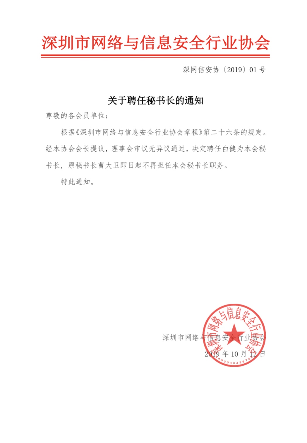 根据《深圳市网络与信息安全行业协会章程》第二十六条的规定。经本协会会长提议,理事会审议无异议通过,决定聘任白健为本会秘书长, 原秘书长曹大卫即日起不再担任本会秘书长职务。