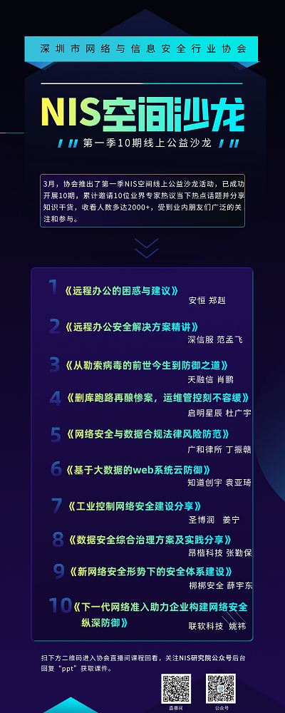 沙龙介绍:是深圳市网络与信息安全行业协会为业内技术人员打造的交流平台,秉承为网络空间安全工作者提供高质量技术交流,为业内组织之间寻求交流合作机会为宗旨,定期举办沙龙活动,为业内专业技术人员创造一个高规格的分享探讨及学习交流环境。