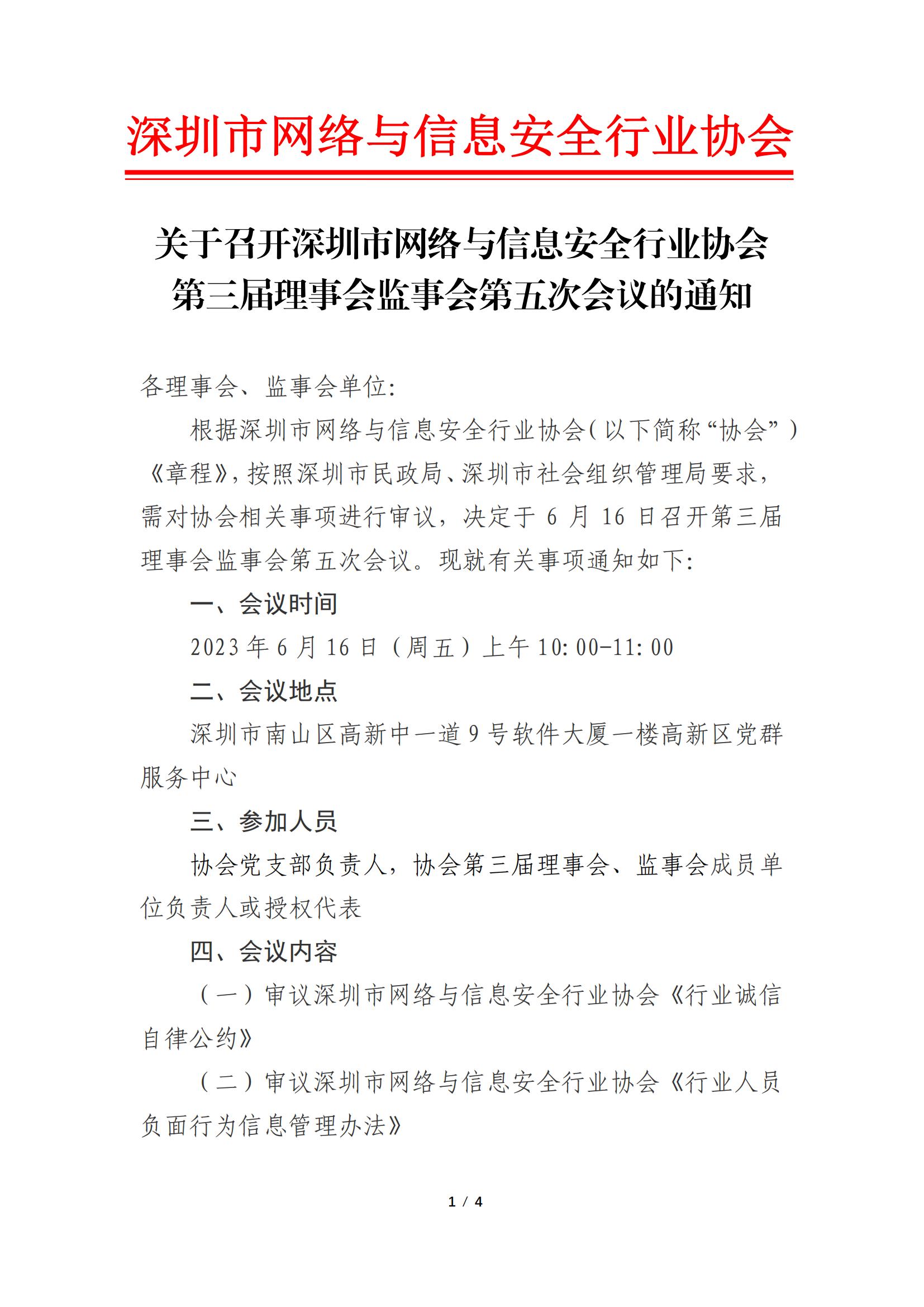 关于召开深圳市网络与信息安全行业协会第三届理事会监事会第五次会议的通知