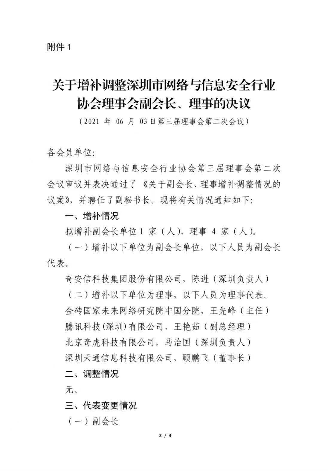 关于增补、调整深圳市网络与信息安全行业协会理事会代表和秘书处副秘书长的通知