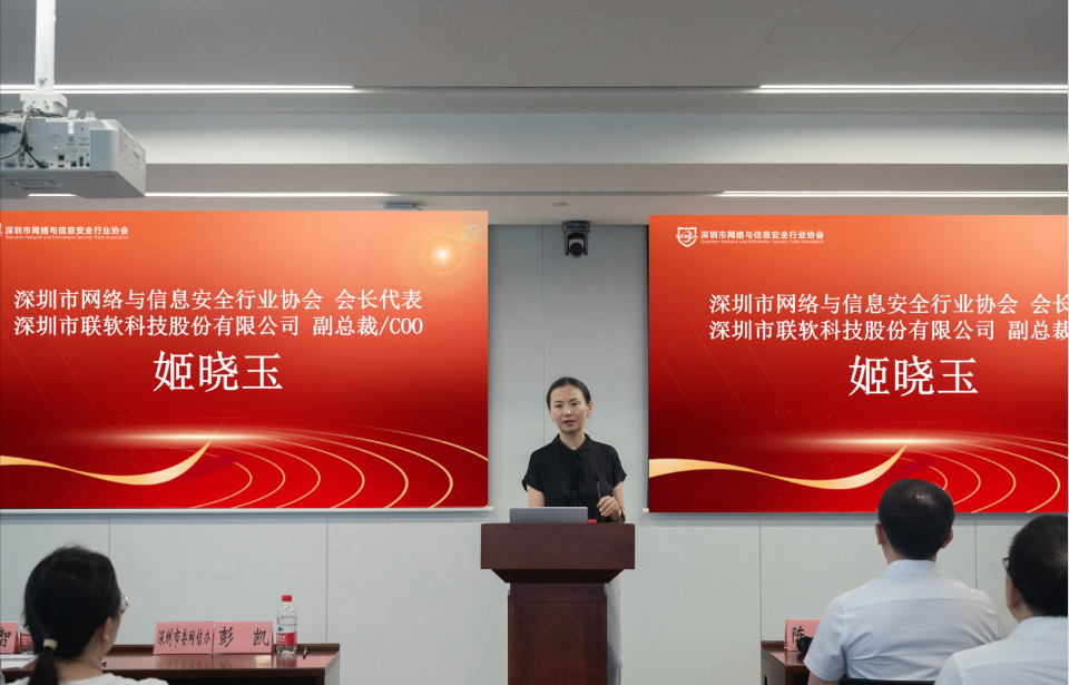 首先,深圳市网络与信息安全行业协会会长单位代表、深圳市联软科技股份有限公司副总裁/COO 姬晓玉发表了行业现状及未来发展趋势的看法,分享了联软科技高质量运营、创新性发展经验以及取得的技术研发与产品成就。同时,作为会长单位,也代表行业发出了团结、自律、合作的呼声,强调行业寒冬中更应该保持韧性,坚守事业初心,坚信前行必有曙光。其温暖、有力的发言,让现场行业同仁备受鼓舞。