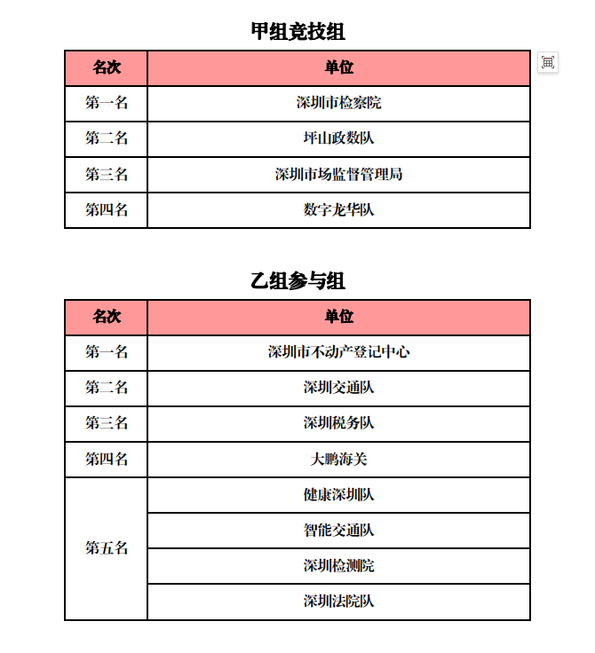 本届比赛适逢年度最强寒潮来袭,比赛当天最低气温仅为5摄氏度,但极寒的天气没有阻档全体参赛队员的热情,上演了一场场精彩纷呈的比赛。经过一天的激烈角逐,最终深圳市检察院代表队、深圳市不动产登记中心代表队分别获得甲/乙组冠军。