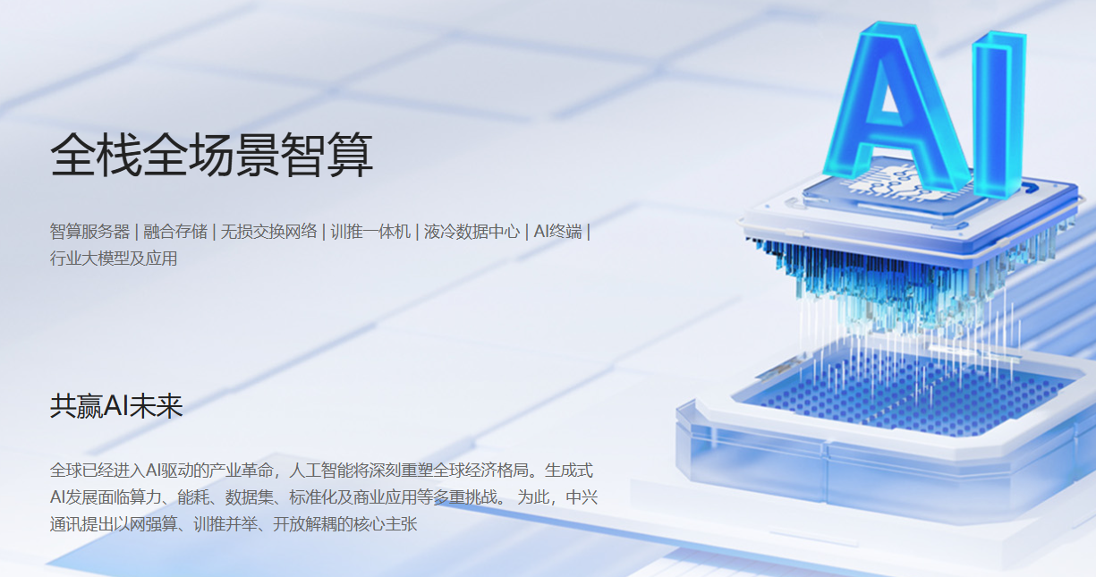 面向AI时代,中兴通讯以客户价值为核心,提供从算力、网络、能力、智力到应用的全栈智算解决方案。多层次、多样化的解决方案为用户提供了更加个性化的选择,从大模型训练智算中心到训推混合智算中心再到边缘训推一体机,满足不同场景下的性能、成本和服务的差异化需求。