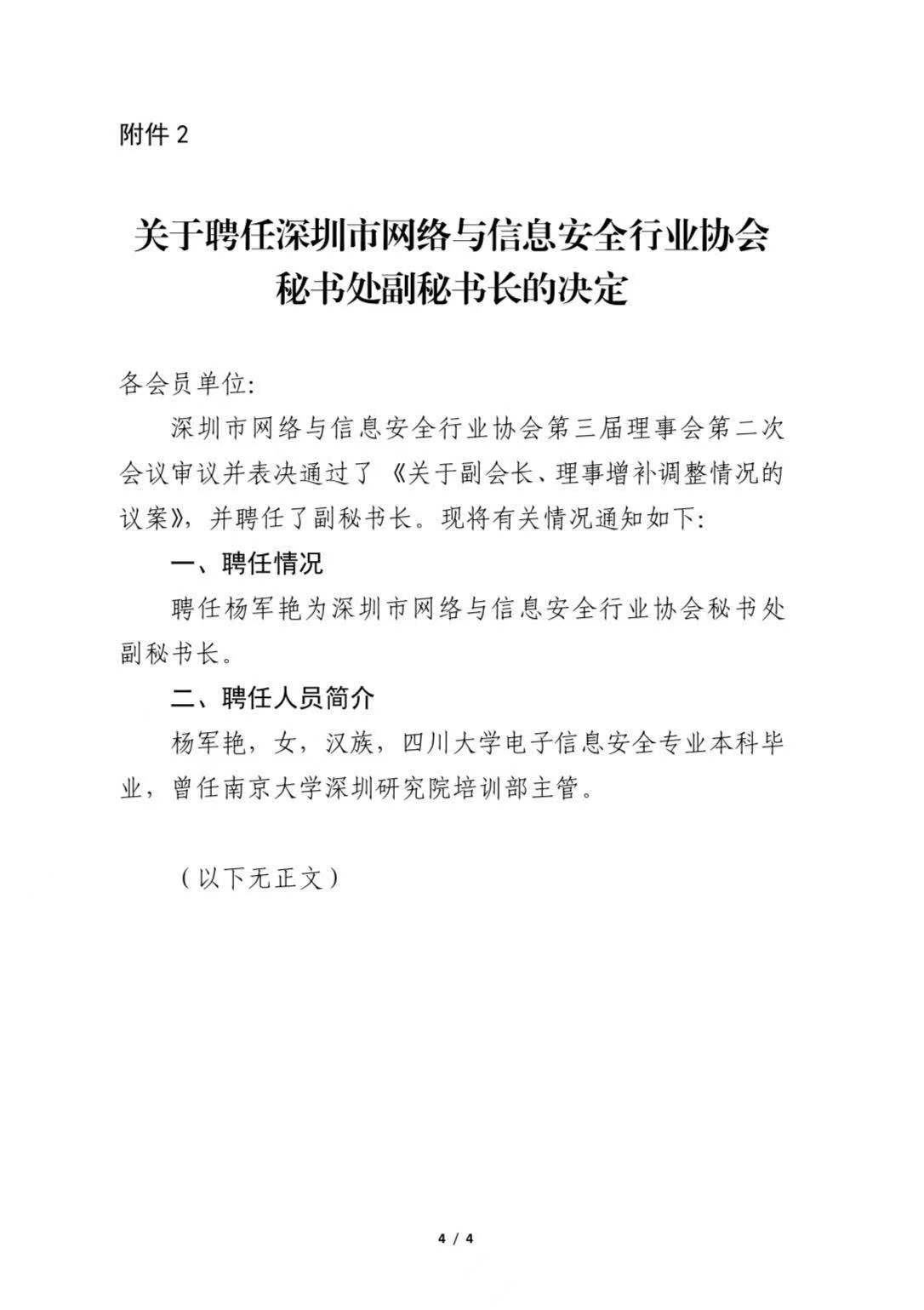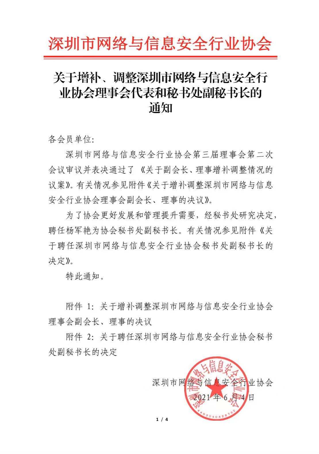 关于增补、调整深圳市网络与信息安全行业协会理事会代表和秘书处副秘书长的通知