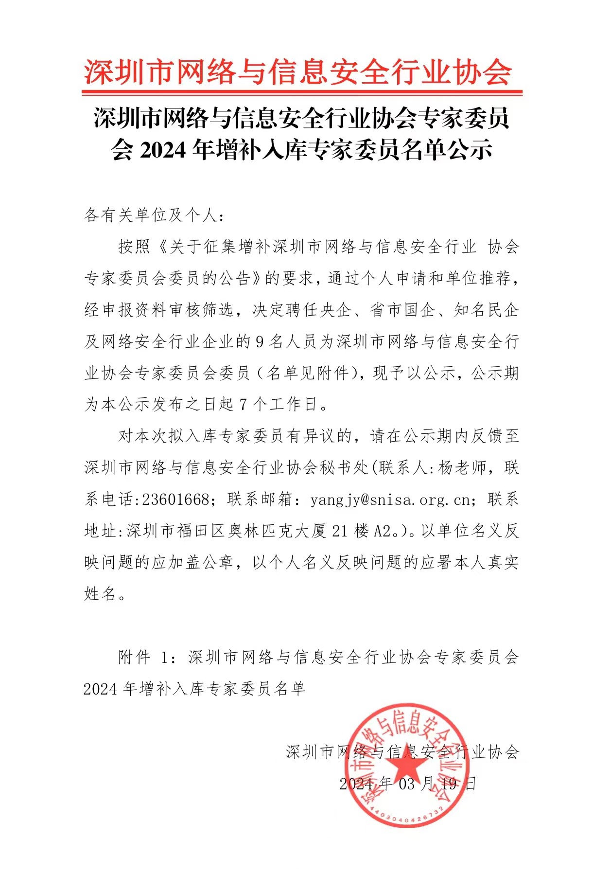 深圳市网络与信息安全行业协会专家委员会 2024年增补入库专家委员名单公示