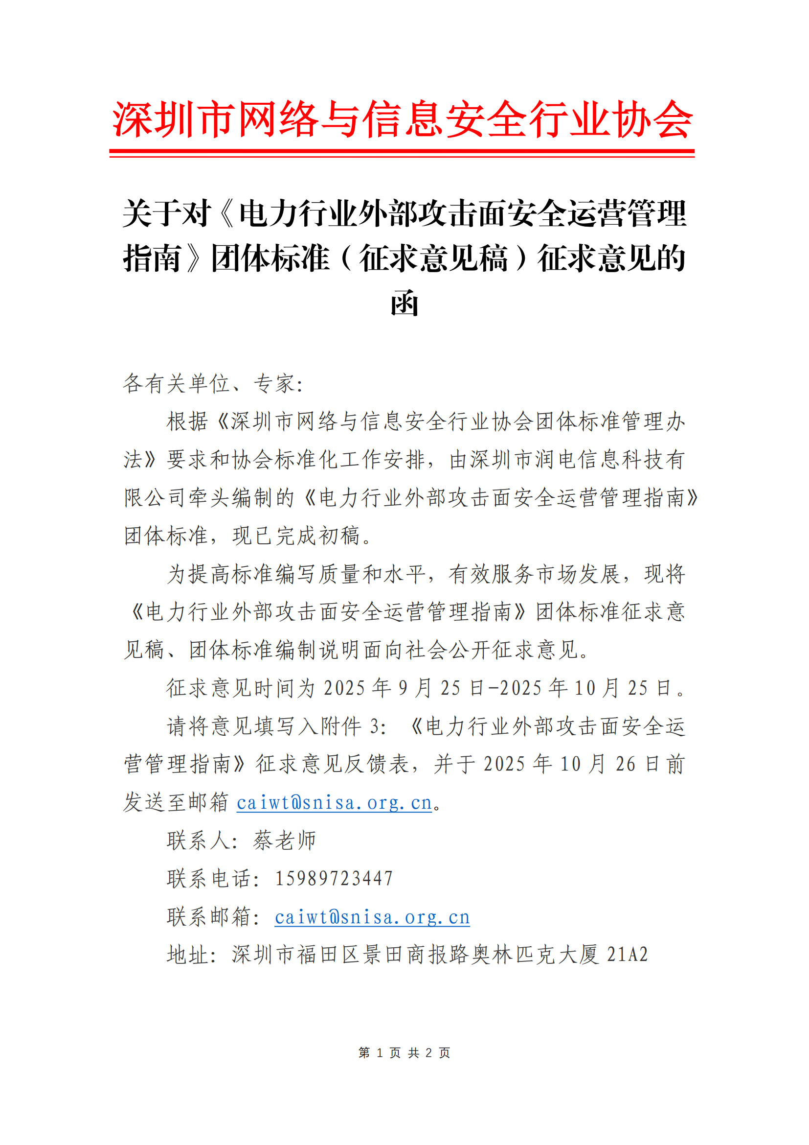 关于对《电力行业外部攻击面安全运营管理指南》团体标准(征求意见稿)征求意见的函