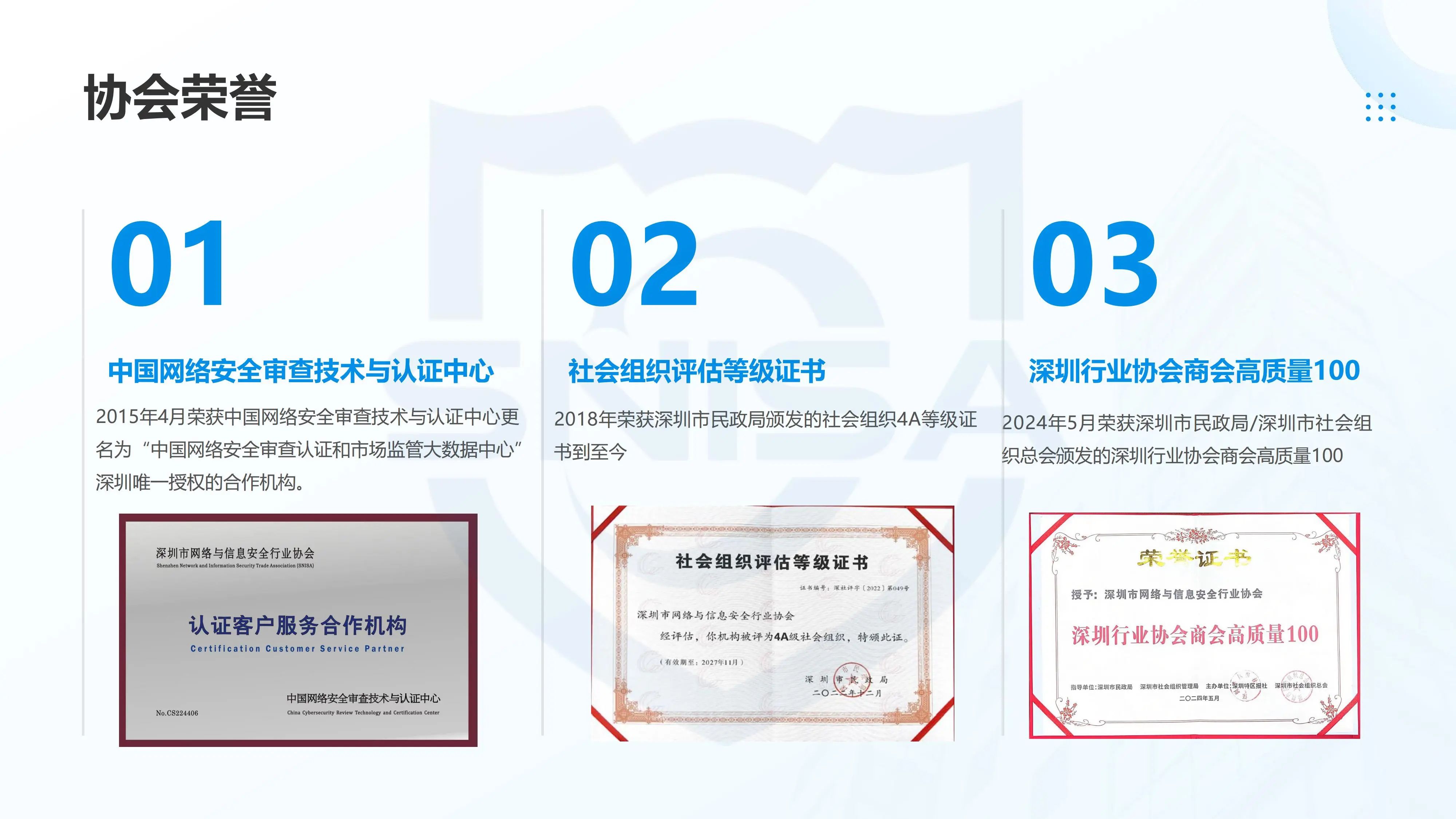 协会是行业专家聚集地,提供卓越的服务,帮助企业赋能,致力于深圳网络与信息安全行业的永续成长和企业的社会价值创造。
